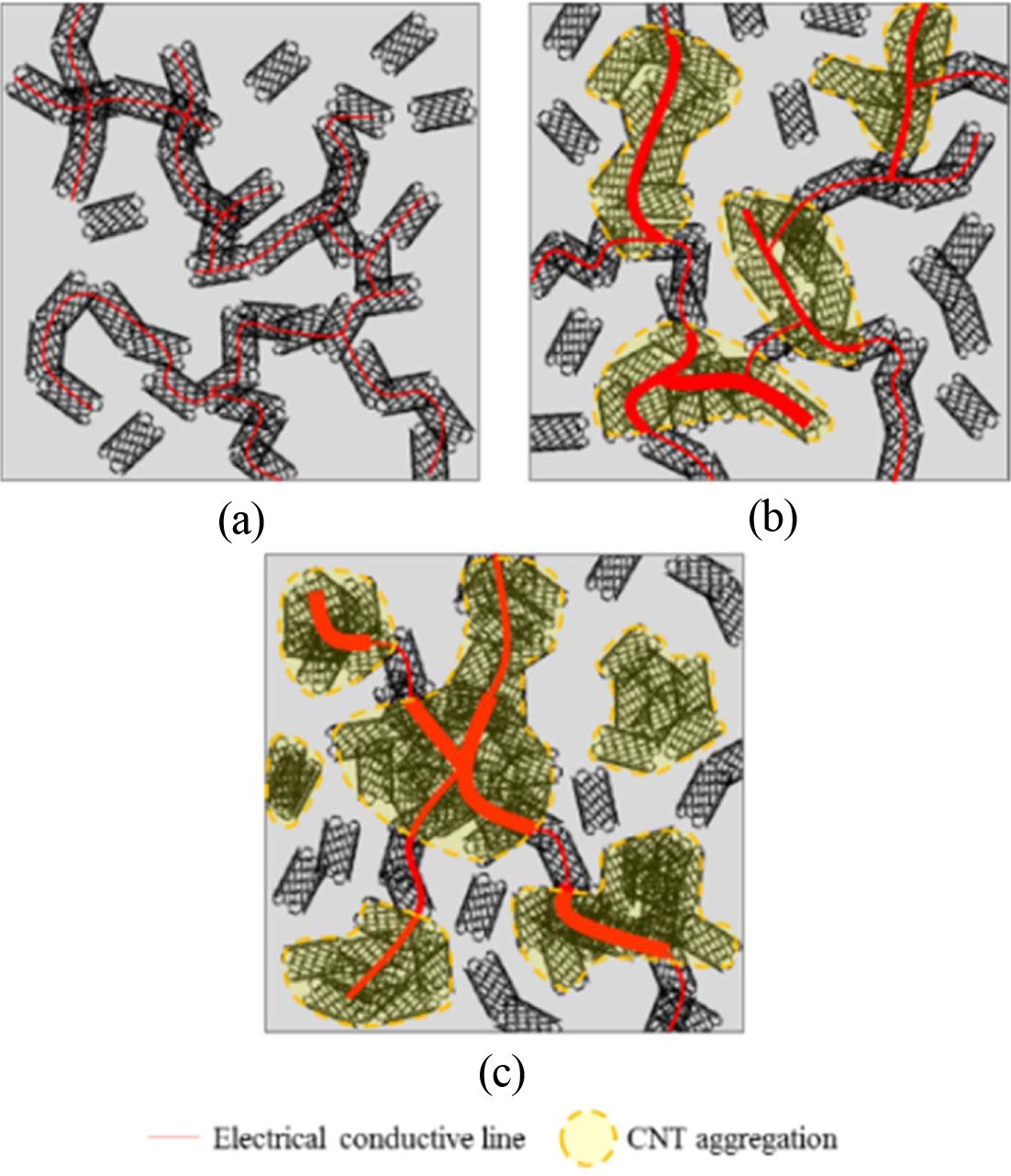Fig. 6 Schematic arrangement of CNT array in PU topcoat: (a) 1 wt%; (b) 2 wt%; (c) 3 wt% |