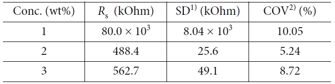wt%를 넘어감에 따라 응집정도가 심해지는 것을 확인할 수 있었다. 탄소나노튜브의 응집이 심해짐에 따라 전체적인 표면저항 자체가 약간 증가되는