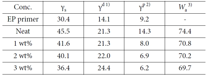 함량이 증가됨에 따라 분산 표면에너지는 거의 유지되었으나 극성 표면에너지는 급격하게 감소되었고, 이에 의하여 에폭시 프라이머와 접착일접 감소되는