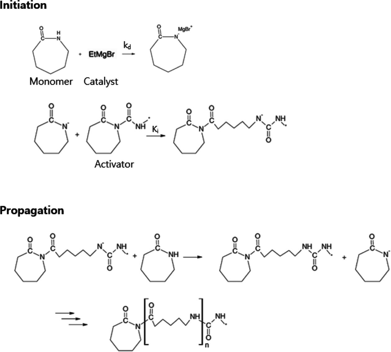 ε-카프로락탐이 개환되면서 음이온 중합을 하는 중합 메커니즘으로 촉매가 단량체와 반응하는 속도가 매우 느리기 때문에 활성제를 넣어서