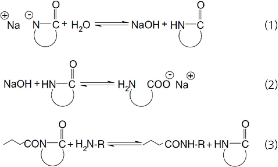 음이온 활성점 사이에서의 반응에서 생기는 수산화나트륨의 추가적인 반응들로 인해 1차 아민 형태의 저분자 화합물이 생성된다. 따라서 최종적으로 폴리아미드