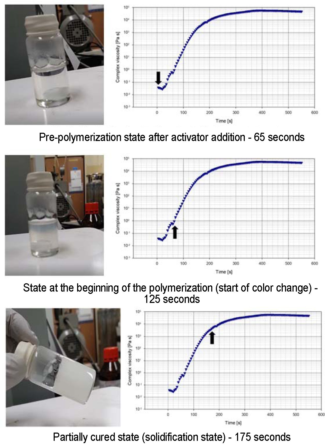 고분자가 흐르지 않는 시점은 중합과 결정화가 어느정도 진행된 상태라고 판단되었다[14]. 이 시간대들을 3번 그래프의 시간대와 비교하였을 때 잘