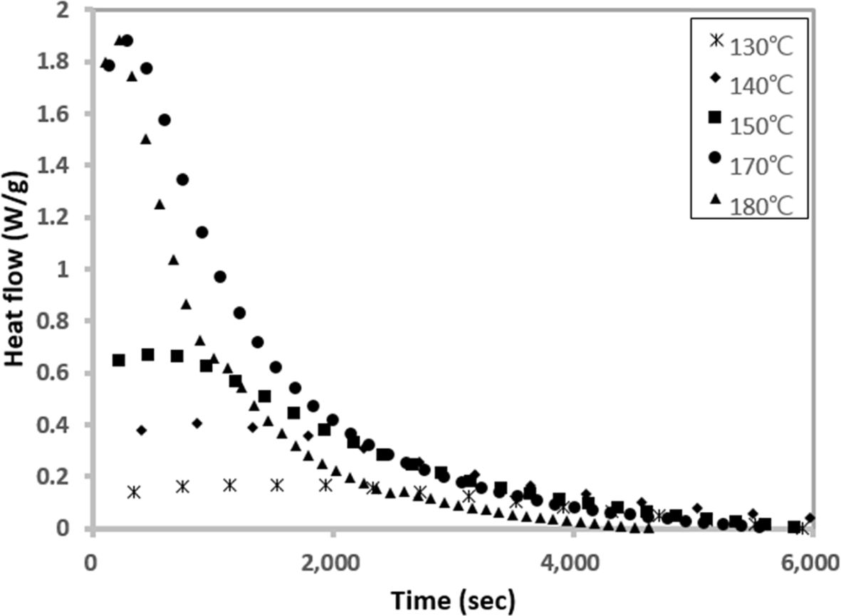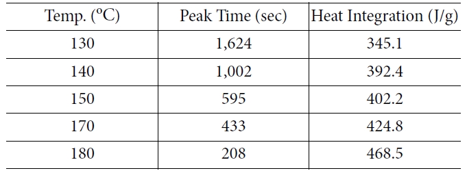 볼 수 있다. 최대 발열량을 나타내는 시간도 130oC에서 약 1,624초로 측정이 되었고 180oC에서는 208초에서 측정되어