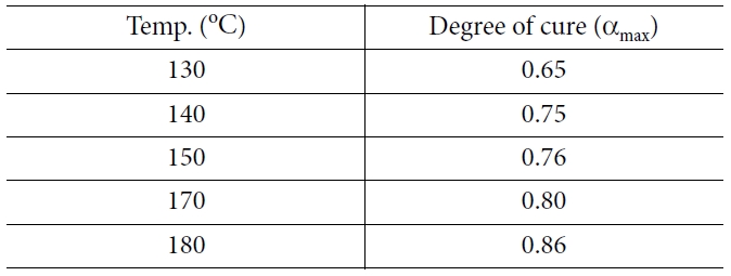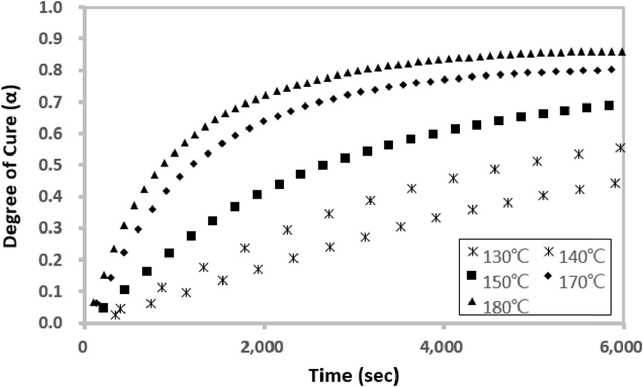경화 반응 속도에 따른 경화도를 분석하기 위하여 등온주사시험을 130oC, 140oC, 150oC, 170oC, 180oC에 대해 진행하였다.
