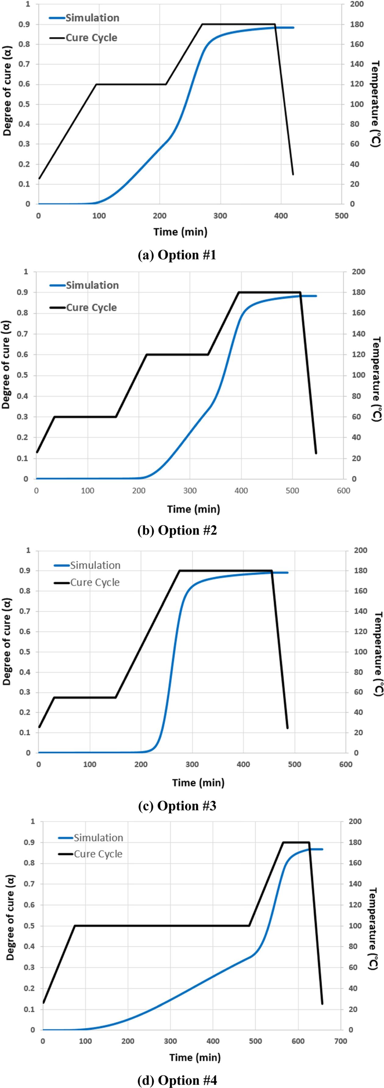 전에 휘발성 물질이나 수분을 제거하는 dwell 구간만을 두어 경화 시간을 줄인 사이클이다[17]. Option #4는 진공압하의 끓는 점보다는 수지 점성의 최저 구간을 활용하여 100oC 부근에서의 dwell 구간을
