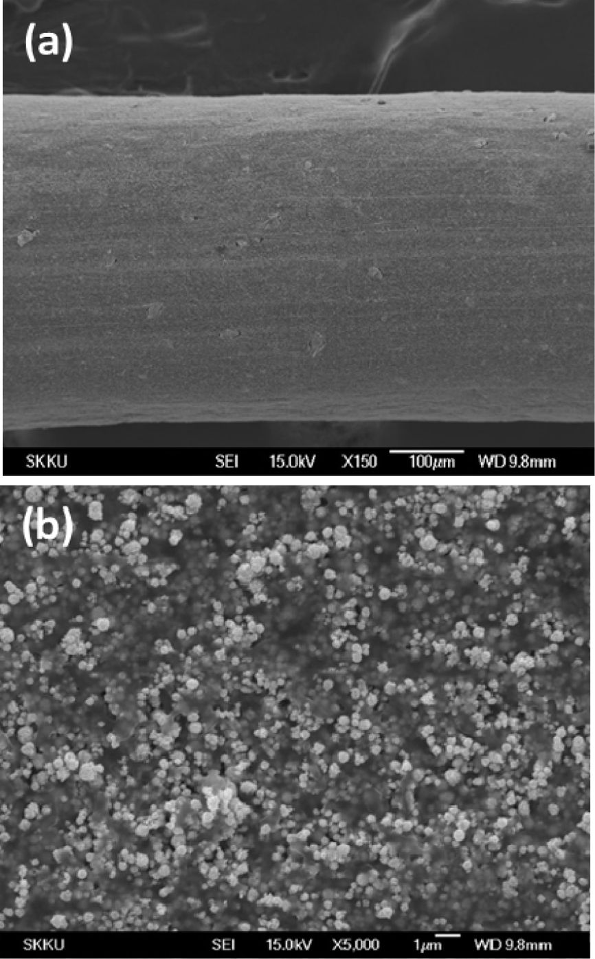 microscopy) 사진이다. 섬유의 평균 직경은 약 440 μm이며(Fig. 1(a)), 수 백 나노미터 크기의 은나노꽃입자가 폴리우레탄에