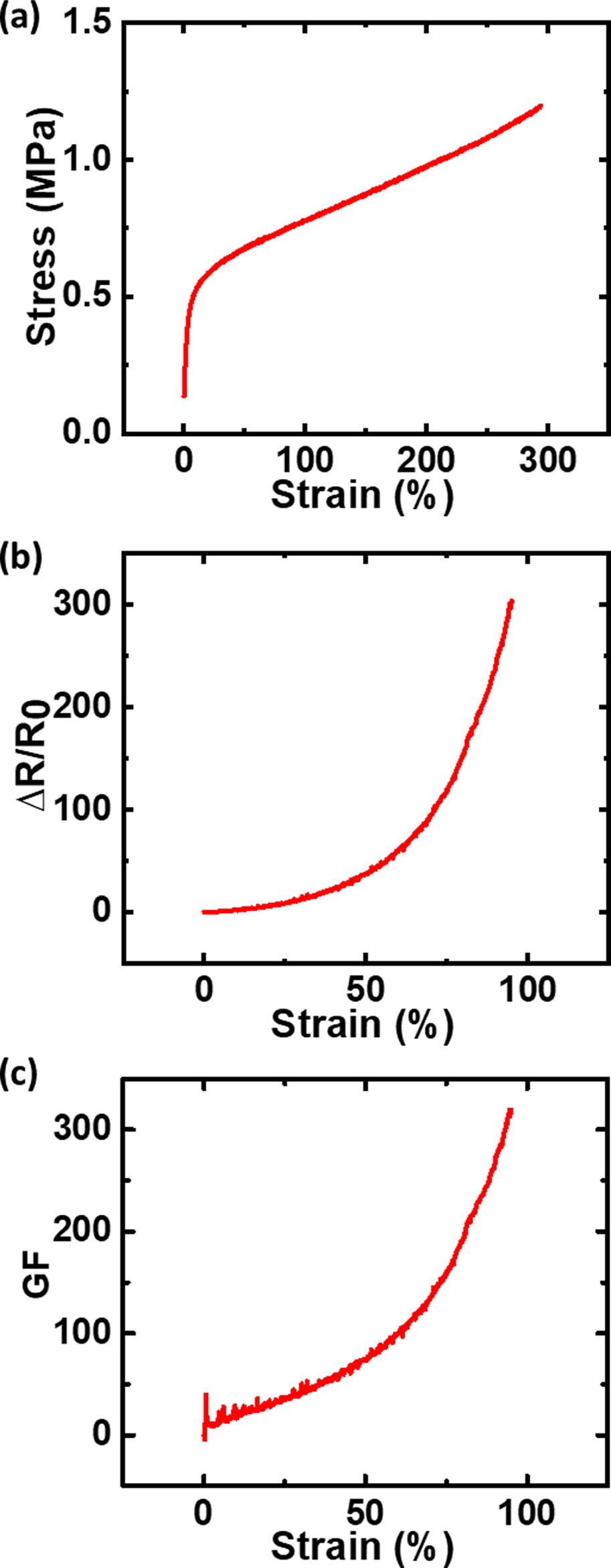 Fig. 2 Mechanical and electrical properties of the composite fibers. (a) Stress-strain curve, (b) change of the resistance, and (c) change of the gauge factor |