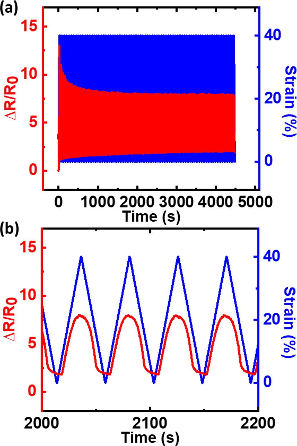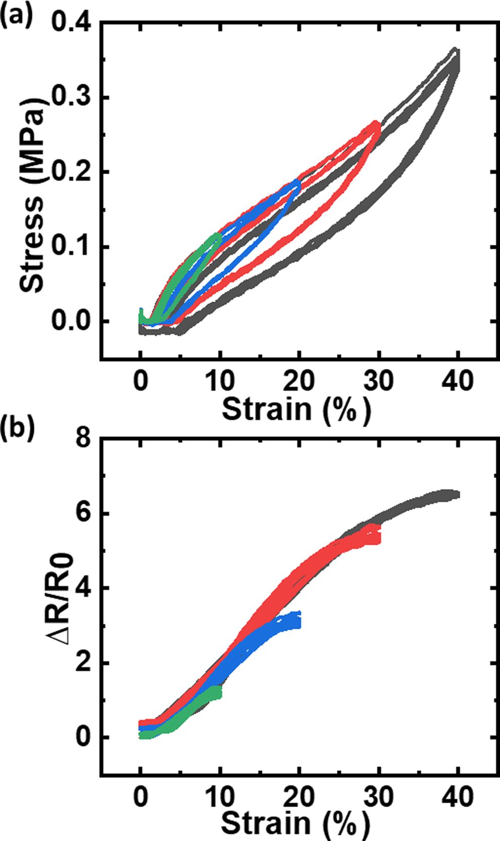 Fig. 3(b)는 스트레인에 따른 저항 변화를 보여준다.기계적인 히스테리시스에 비해서, 저항 변화의 히스테리시스는 낮은 것을 확인할