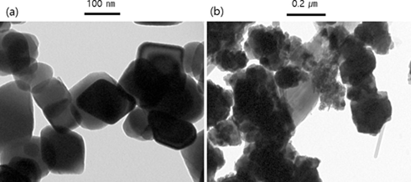 Fig. 1 Result of TEM analysis of Fe3O4 particles: (a) 100 nm, (b) 0.2 μm |