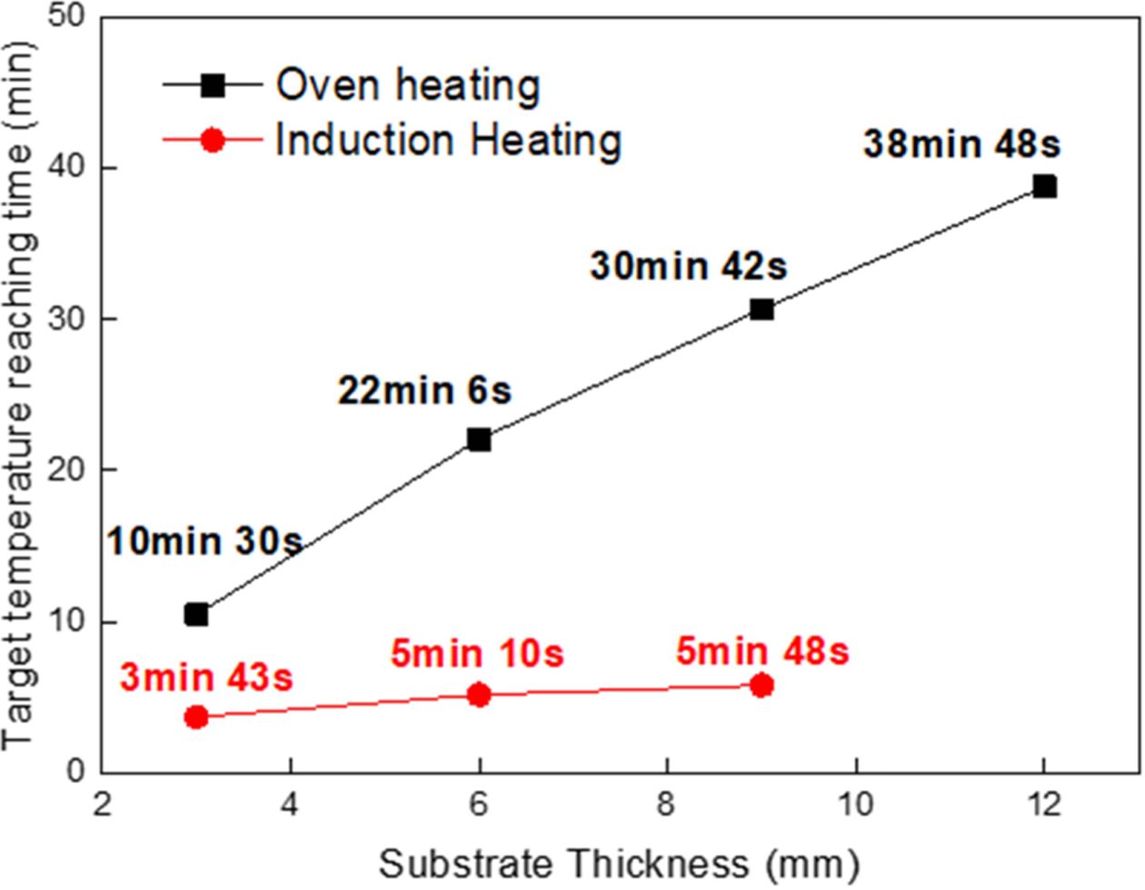 반면에 유도가열의 경우, 피착재의 두께가 3 mm에서 9 mm로 증가할 경우