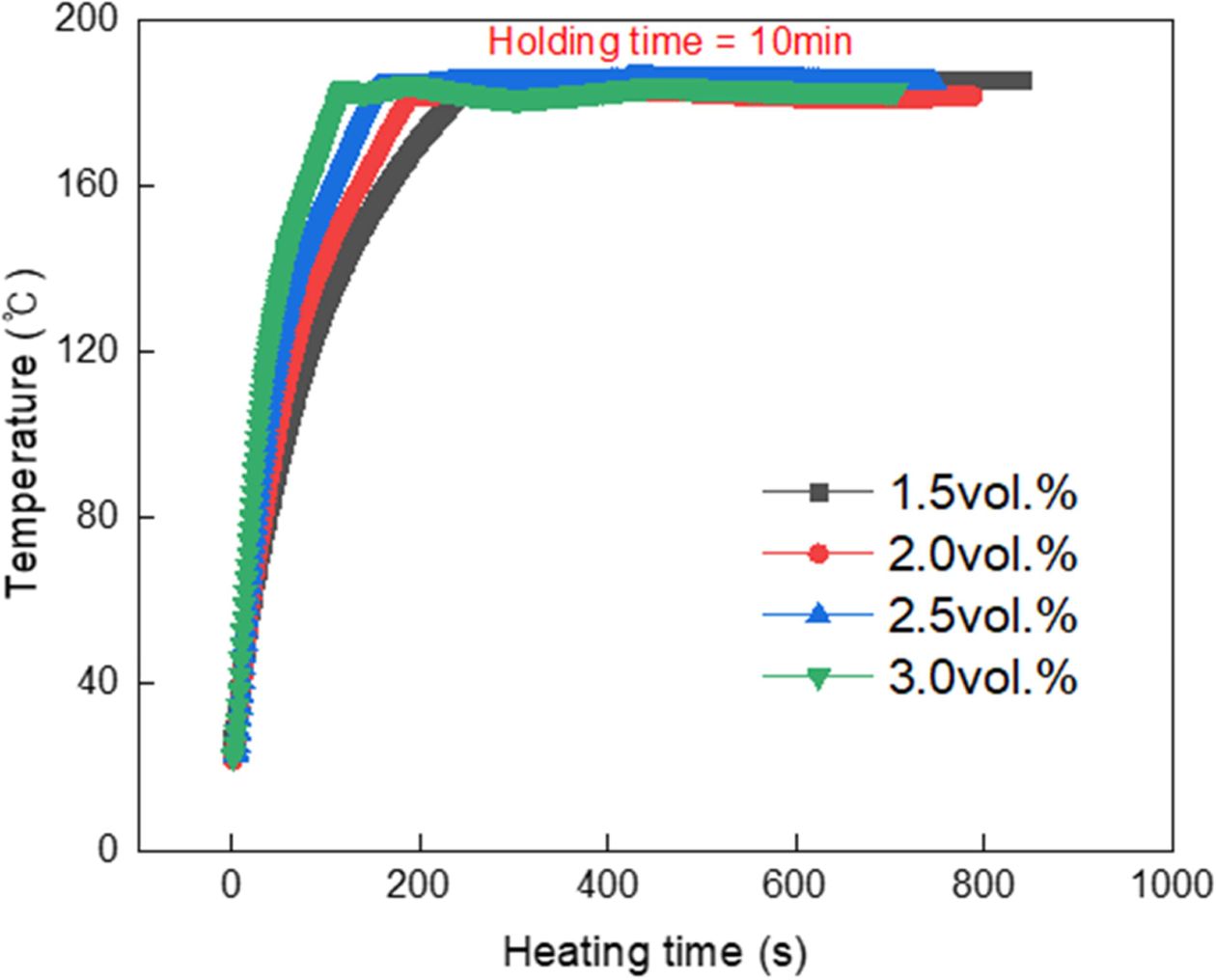 Fig. 6 Temperature plot of 0.2 um Fe3O4 particle embedded adhesive on the variation of content |