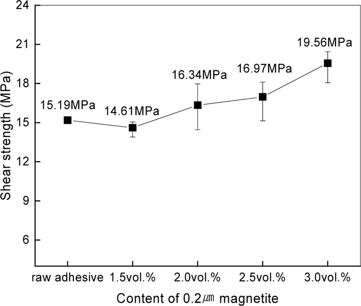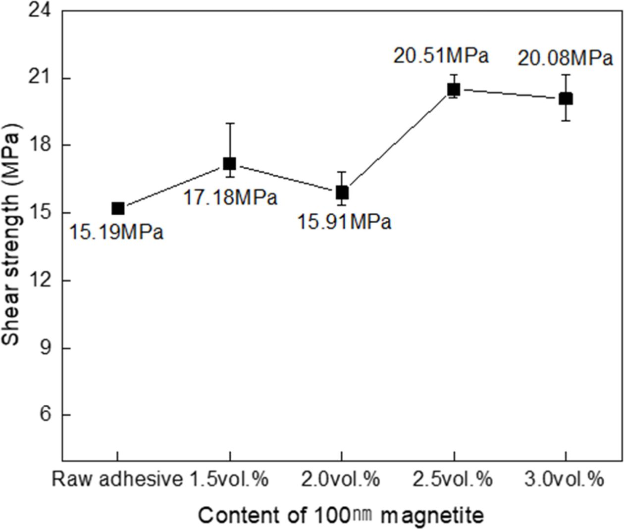 전단 접착 강도 역시 증가하는 결과를 나타냈으며 전체적으로 Fe3O4를 첨가하지 않은 에폭시 접착제에 비교하여