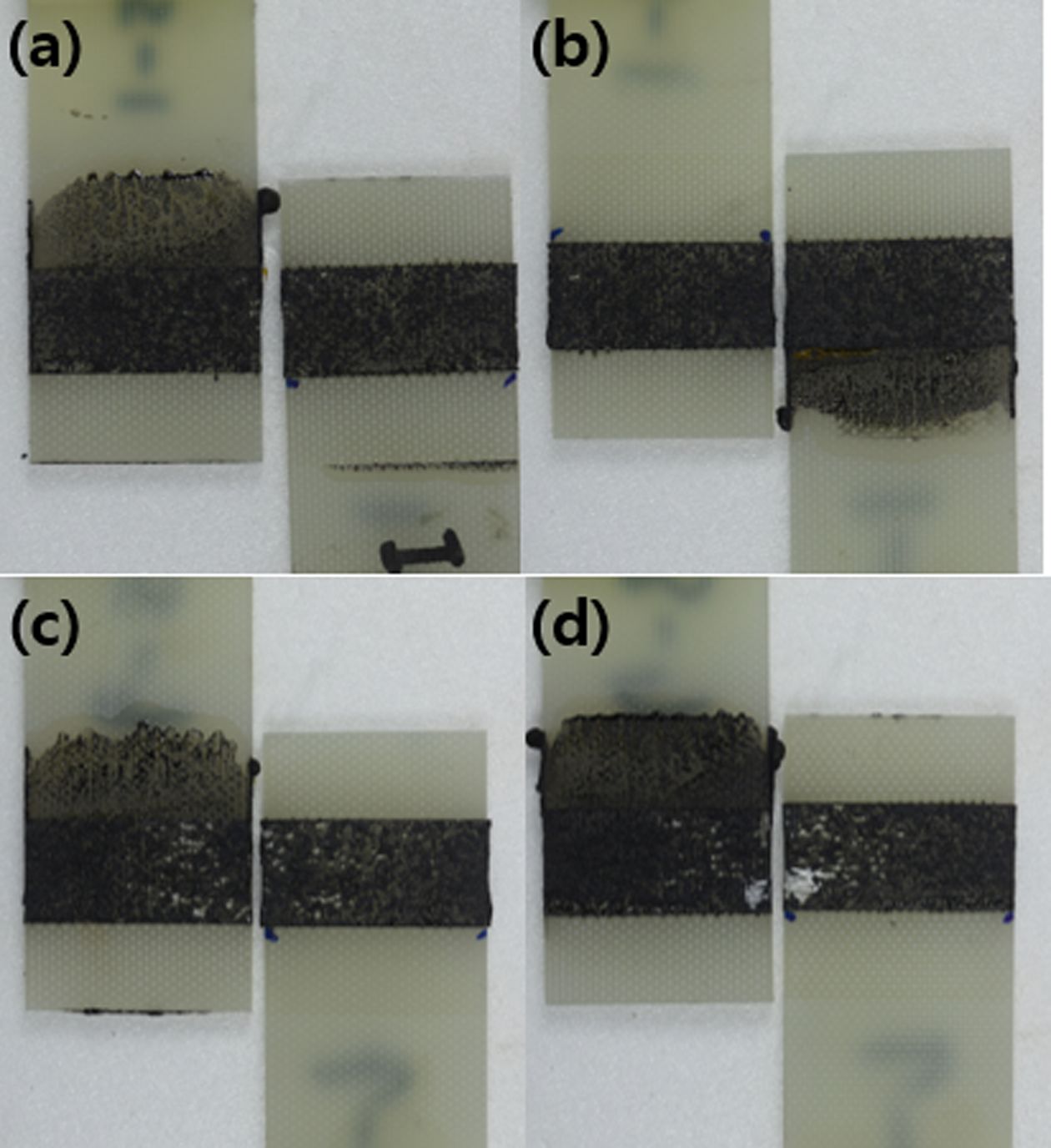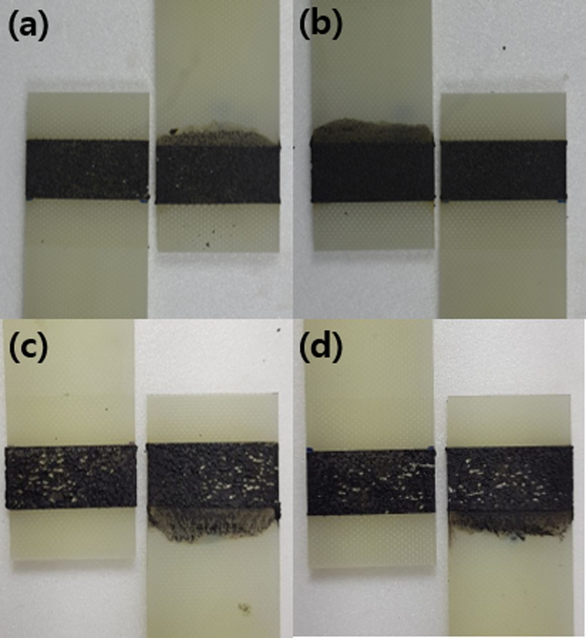 Fig. 8 Failure mode of 100 nm Fe3O4 embedded adhesives. (a) 1.5 vol.%, (b) 2.0 vol.%, (c) 2.5 vol.%, (d) 3.0 vol.% |