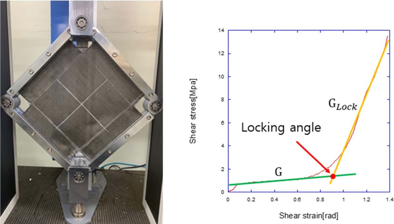 우선 탄소 섬유 직조물의 물질 특성인 전단잠김각을 측정하여 한계 전단 변형을 예측하고, 탄소 섬유 직조물의 스탬핑 공정 중의 드레이핑 특성을 실험적으로