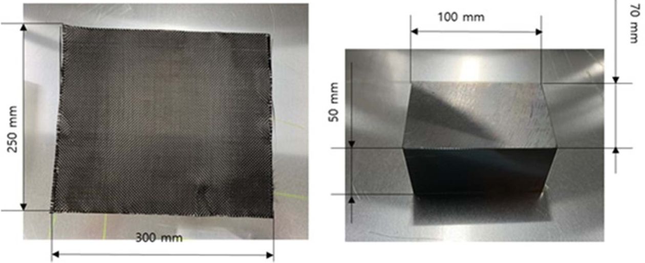 Fig. 3 The carbon fabric sheet (left) and die block used in the draping experiment (right) |