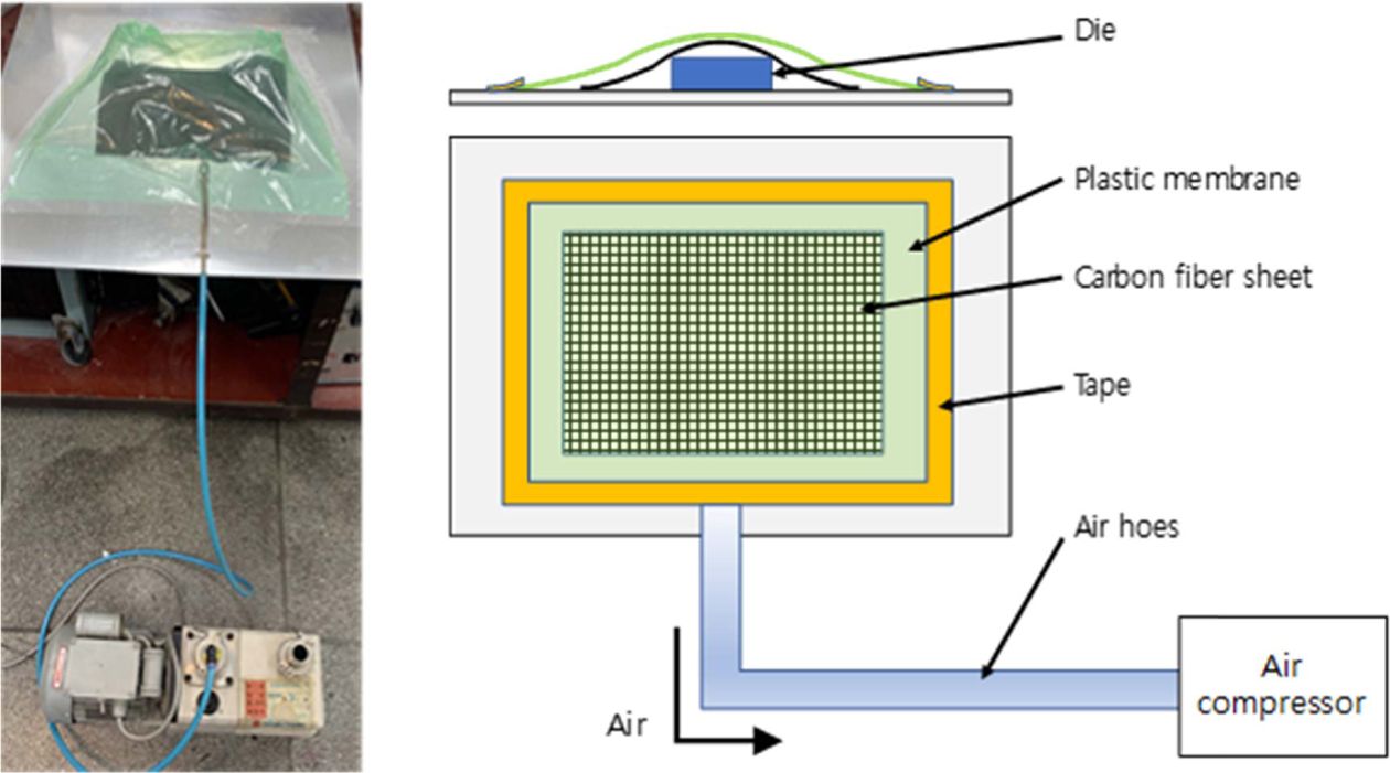 진공 성형 실험은 Fig. 4의 구조로 이루어져 있다. 평평한 판넬 위에 육면체 다이를 올리고 그 위에 실험하고자 하는 배열로 자른