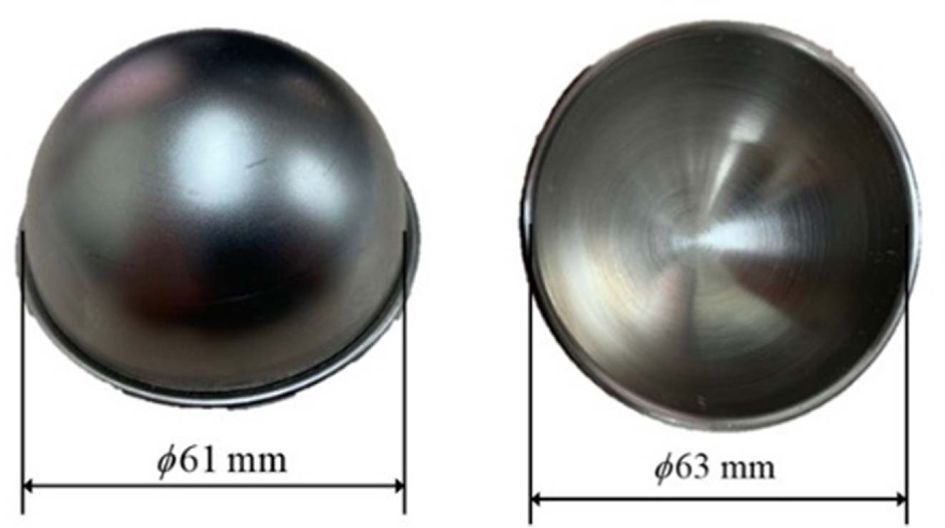 Fig. 5에서의 직경 63 mm 반구형 펀치와 직경 61 mm의 다이를 사용하여