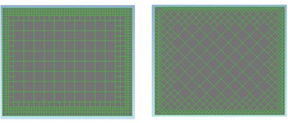 다이의 격자계 형상을 나타낸 것이다. 프리폼에서는 드레이핑에서 나타나지 않는 탄소 섬유 직조물의 적층에 따른 소재의 성형성의 차이를 확인하고자