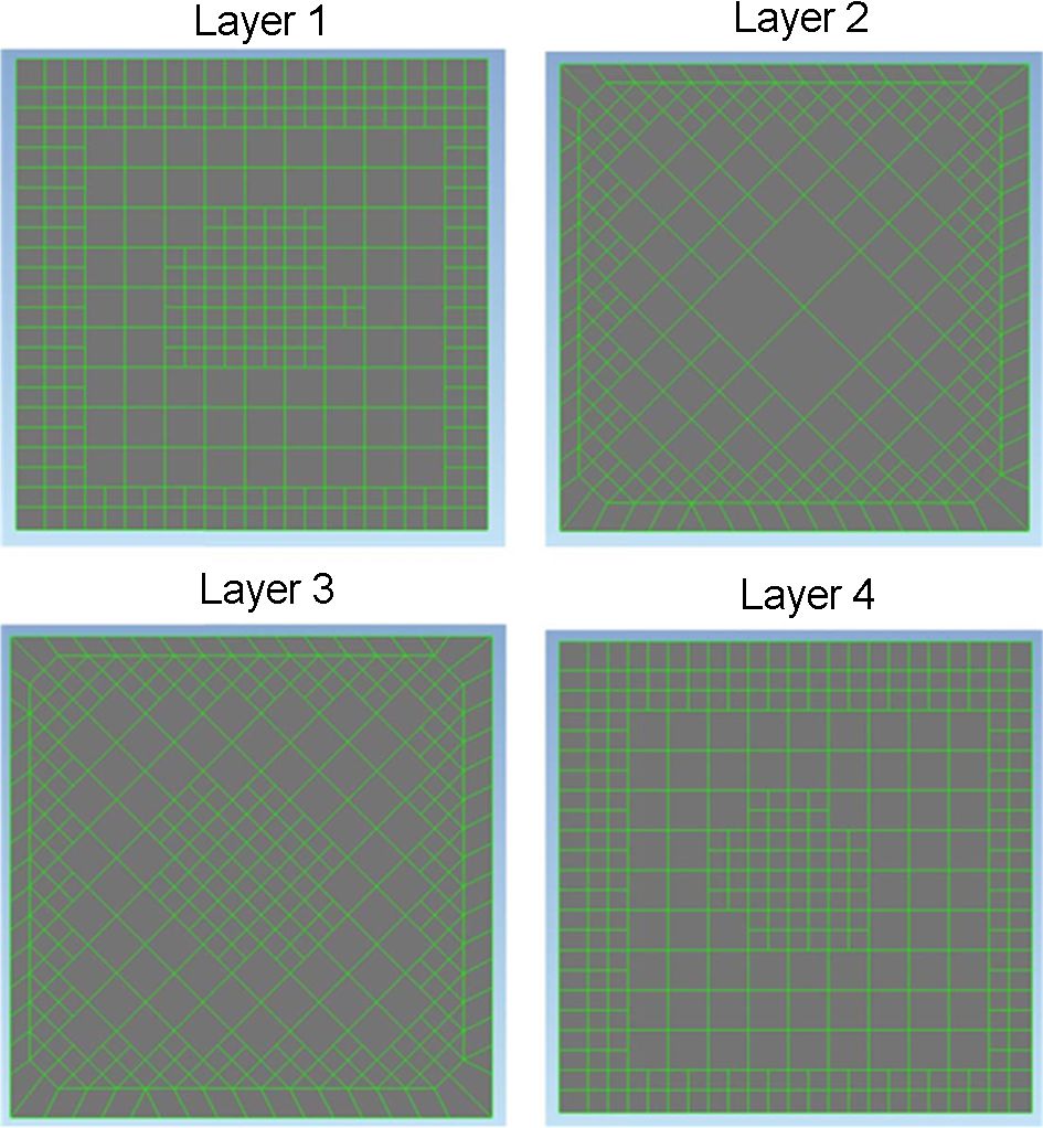 프리폼 실험을 수행하였다. 아래와 같은 적층 순서대로 층(Layer) 별 번호를 부여하여 총 4개의 층으로 실험을 진행하였다.