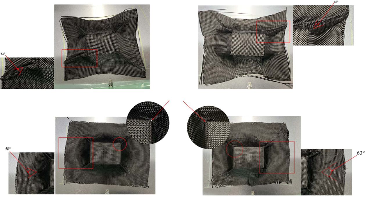 Fig. 10 Draping experiment results with the rectangular block: 0o, 90o, 45o, -45o in the order of upper left, upper right, lower left, lower right |