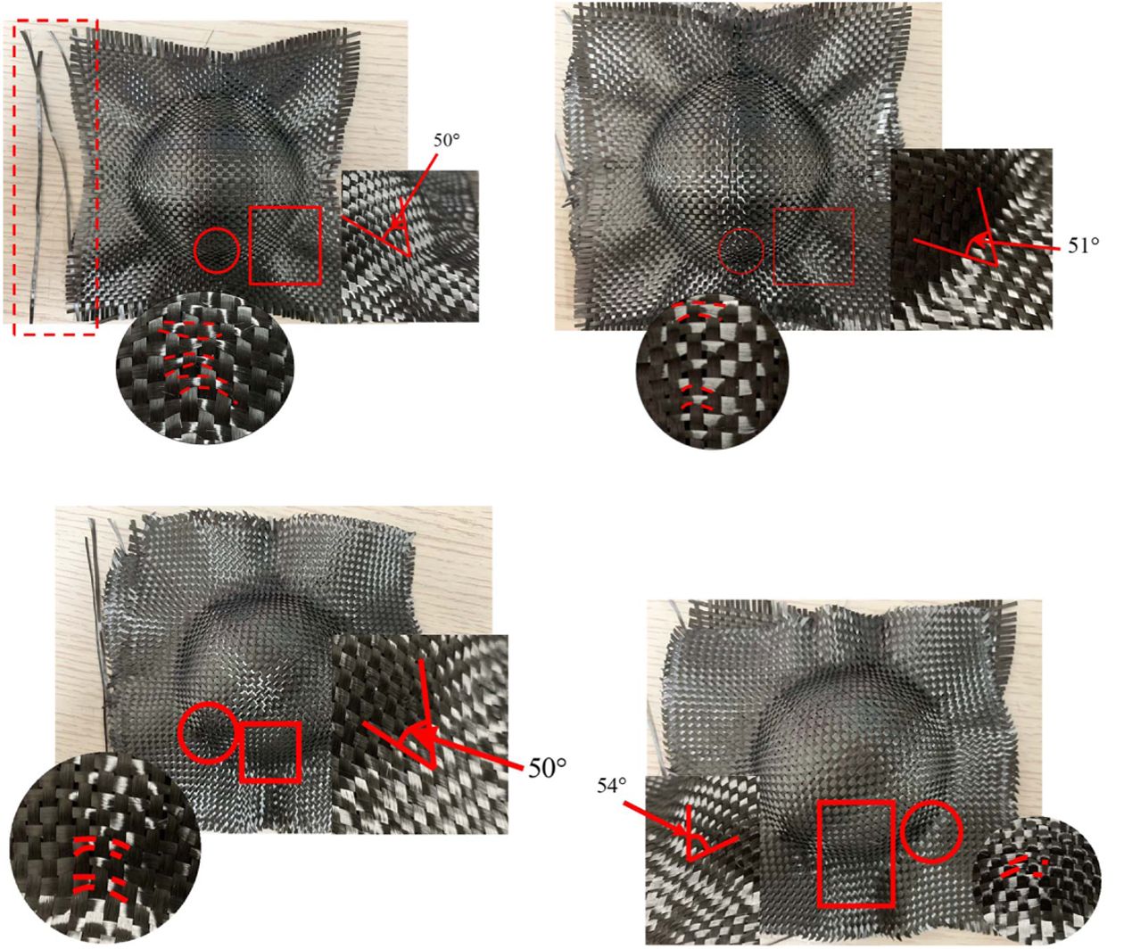Fig. 11 Draping experiment results with the hemispherical die: 0o (Layer 1), 90o (Layer 4), 45o (Layer 2), -45o (Layer 3) in the order of upper left, upper right, lower left, lower right |