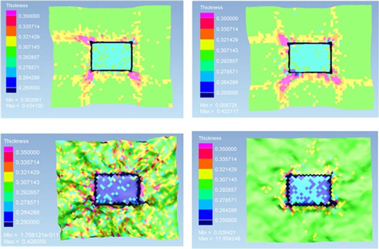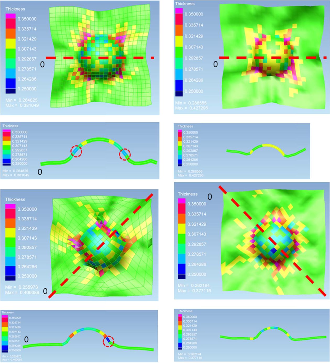 Fig. 13 Draping simulation results with the hemispherical die (thickness variation): 0o (Layer 1), 90o (Layer 4), 45o (Layer 2), -45o (Layer 3) in the order of upper left, upper right, lower left, lower right |