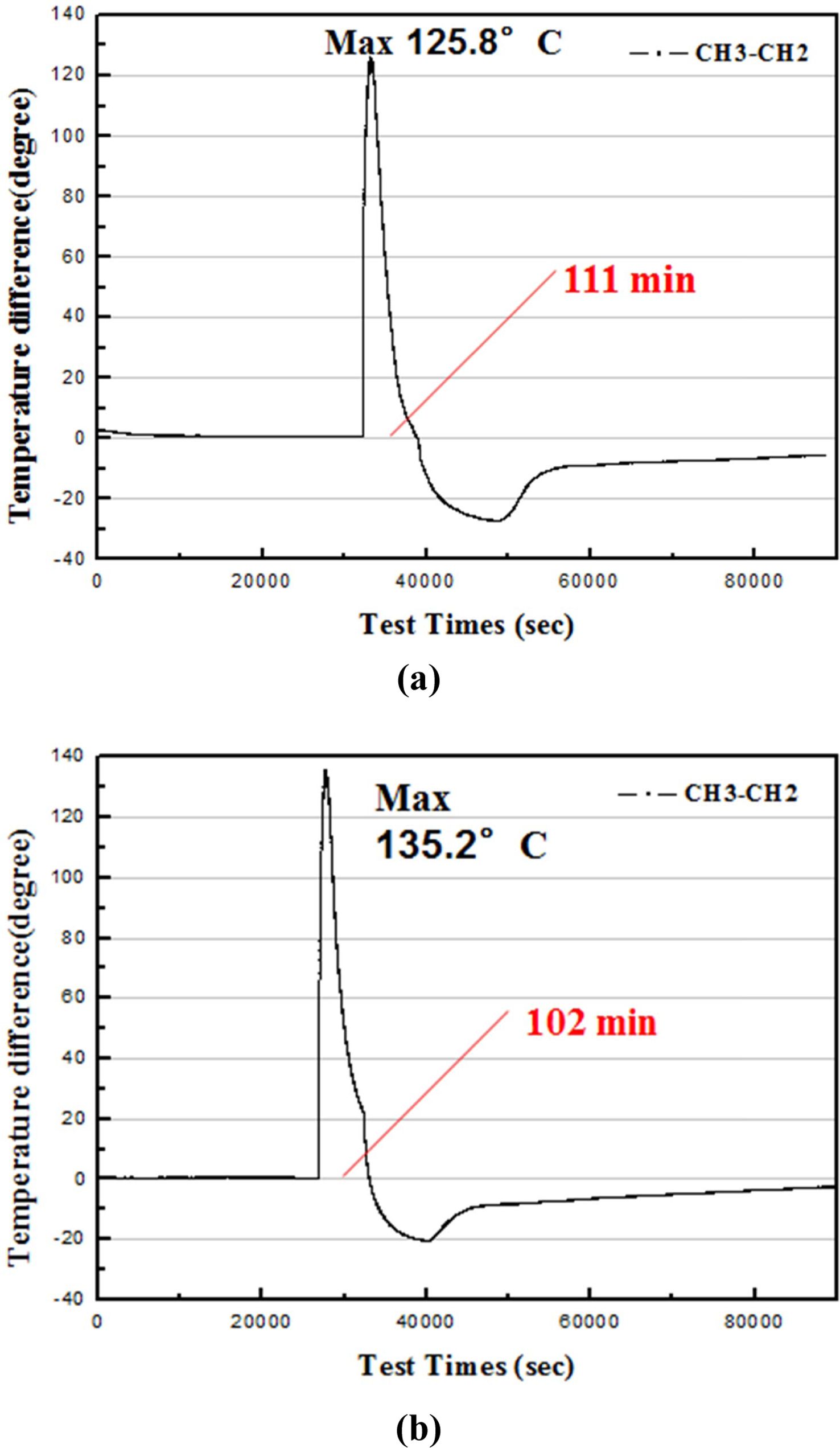 111분이었다. 한편, 코팅층을 도입한 탄소/탄소복합재료에 대한 결과는 Fig. 4의 (b)와 같다. 그래프에서와 같이 그 온도차이는 최대