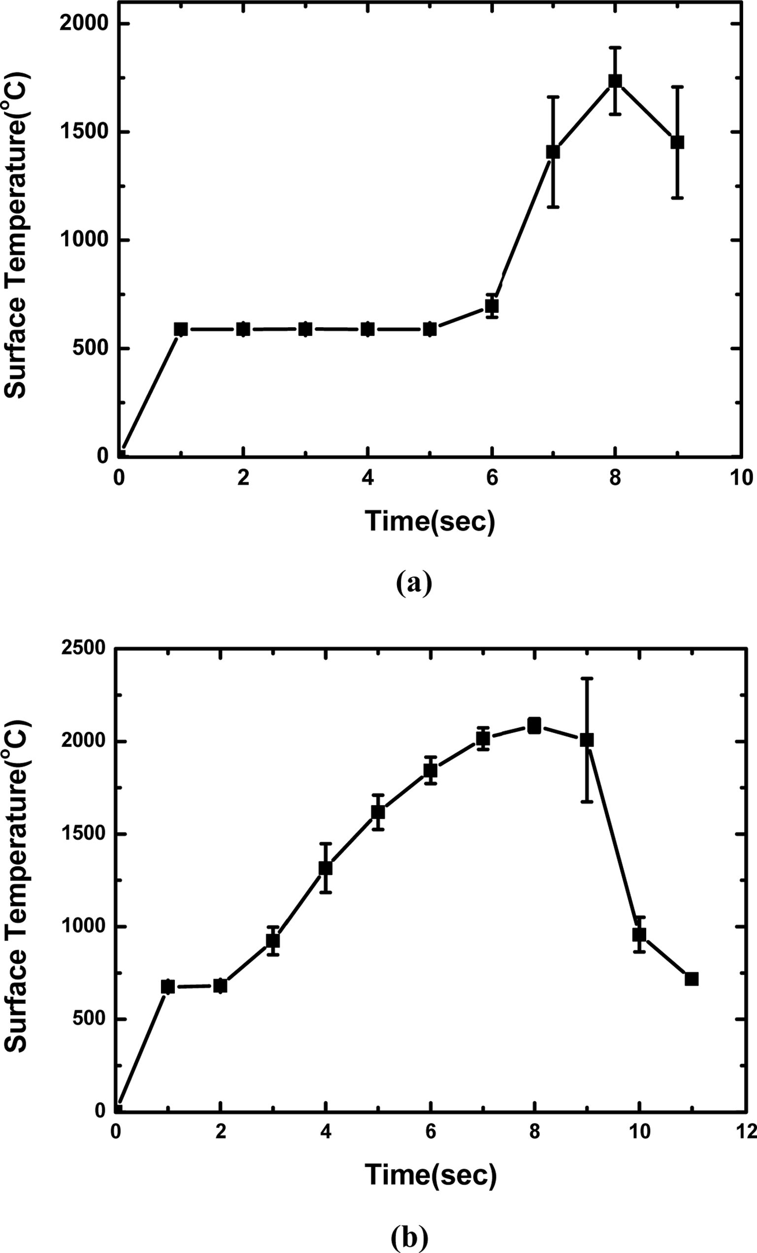 Fig. 5는 고온 버너 실험시 시간에 따른 온도의 변화를 파이로미터로 측정하여 나타낸 곡선들의 한 예이다. Fig. 5의 (a)는