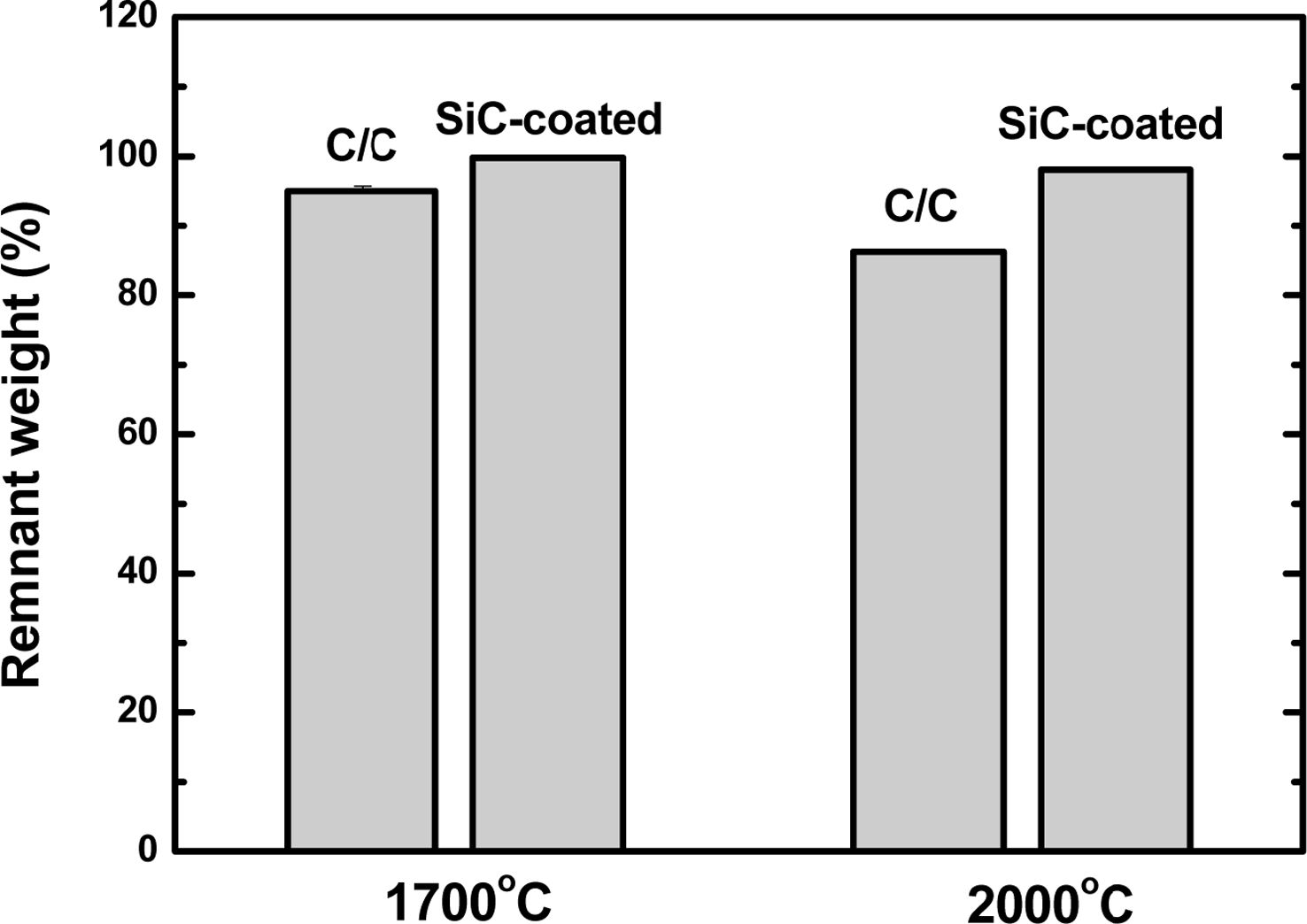 94.99% 잔존한 반면 탄화규소로 코팅한 복합재는 99.78%가 잔존하였다. 보다 높은 온도에서는 탄소-탄소 복합재가 86.26%, 탄화규소로