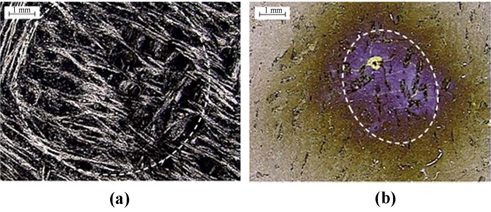 박리가 일어났으며 그림 (c)와 같이 중앙부위가 완전히 박리되어 섬유층이 노출된 사진을 볼 수 있다. 그러나 원형의 테두리 주위로 코팅층이 남아있음을 확인할 수 있다. 코팅층의