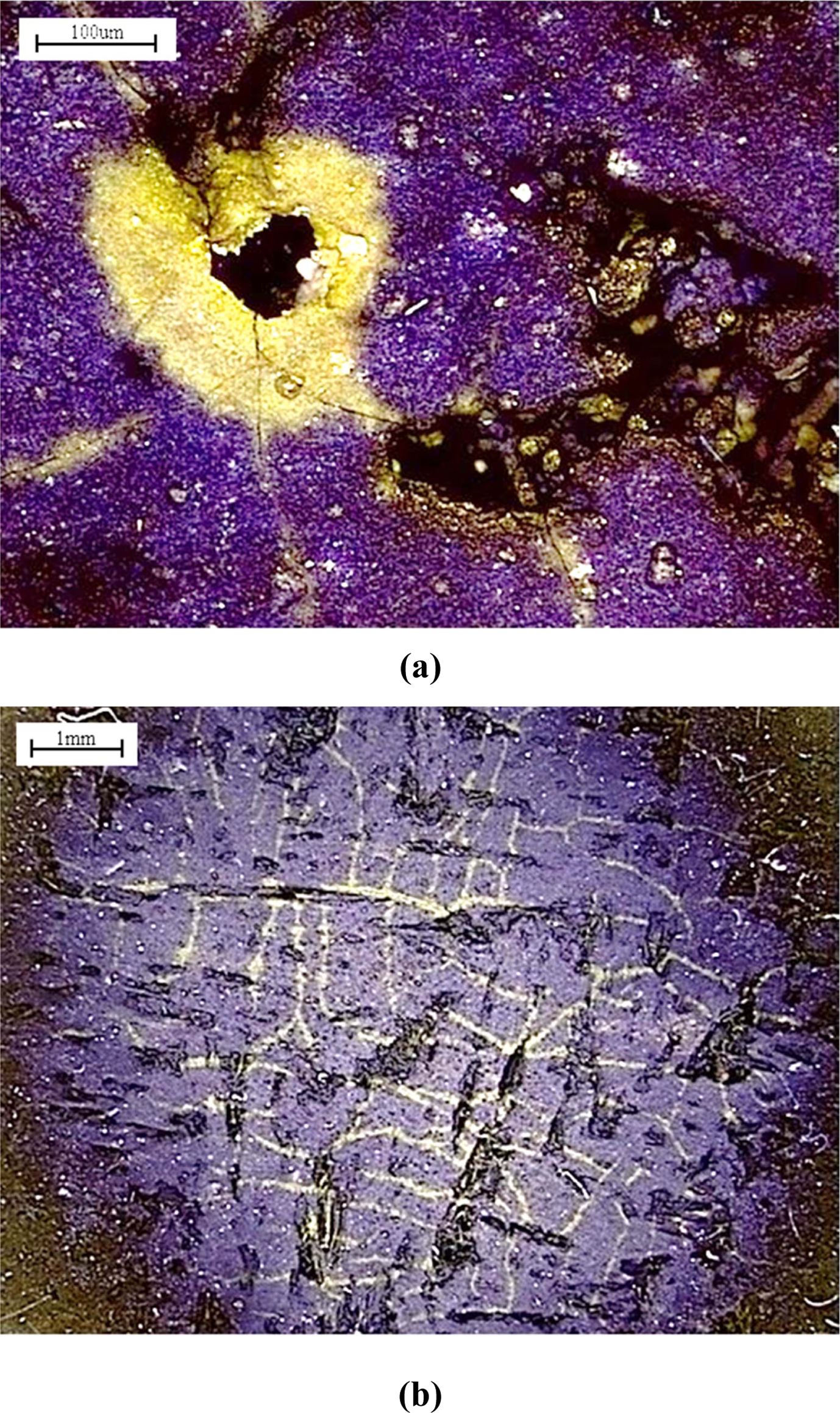 일어났으며, 박리가 일어난 주위로 균열이 형성되었음이 관찰되었다. Fig. 8의 (b)와 같이 거시적 균열들이 네트워크 구조의 양상으로 일어남이