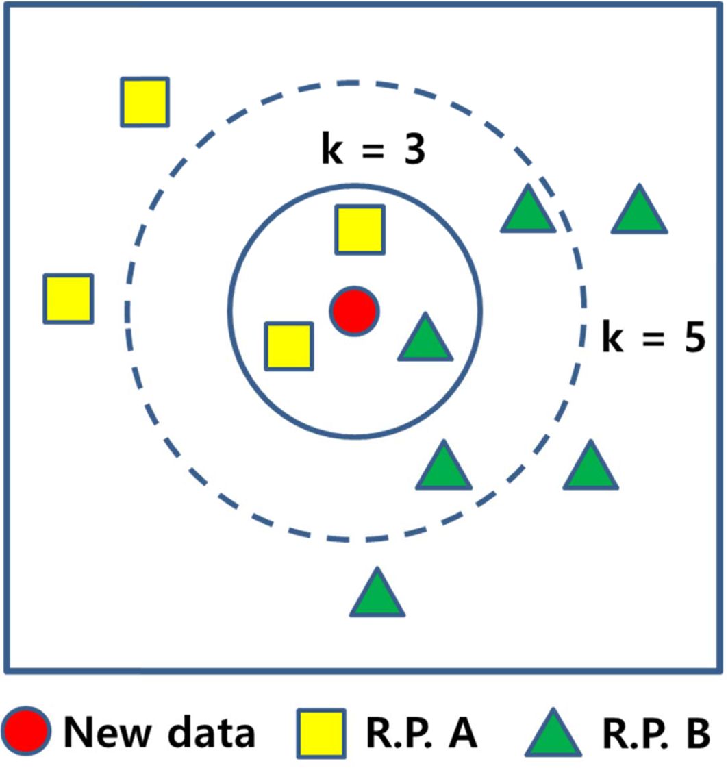 = 3인 경우, 새로운 데이터에서 가장 가까운 3개의 기존 데이터는 R.P.A가 2개, R.P.B가 1개이다. R.P.A가 과반 이상이므로 새로운