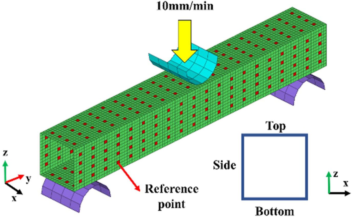 알루미늄 보의 하중 유형을 분석하기 위하여 선행적으로 3점 굽힘 해석을 진행하였다. 유한요소 모델은 Fig. 3와 같이 제작하였으며,