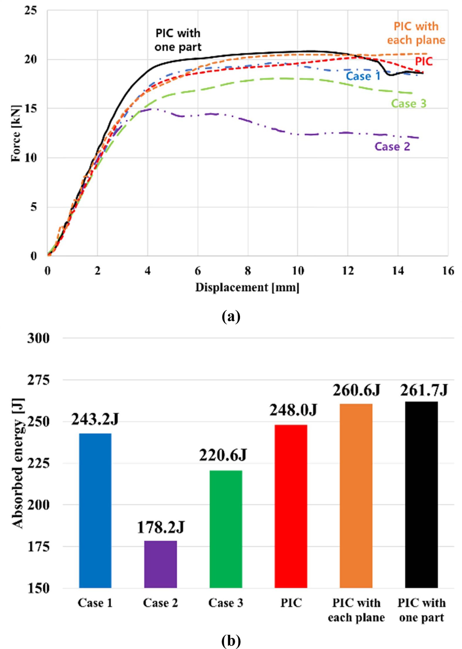 각 case들의 3점 굽힘 해석 결과, Fig. 7과 같이 최대 하중은 PIC with one part, PIC with each