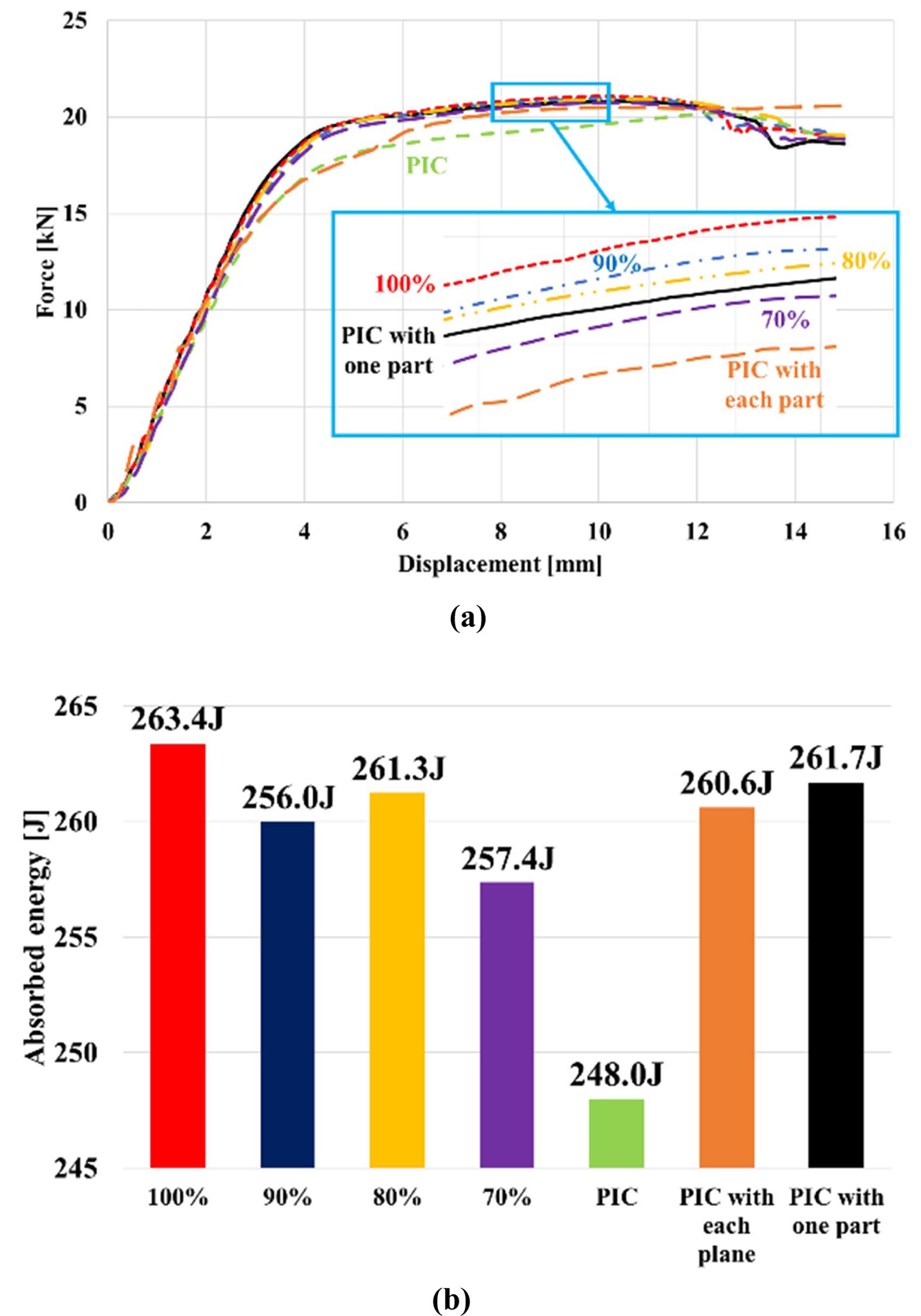 Fig. 7 Results of 3 point bending analysis: (a) Force vs displacement curve, (b) absorbed energy |