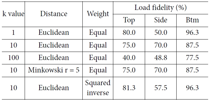 plane)과 전체 면에 대한 k-NN 분류 모델을 구성하는 방법(one part)을 이용하여 k-NN 분류 모델을 생성하였고, 하이퍼파라미터의 튜닝을 통하여 다양한 하중 충실도를 도출하였다. 가장