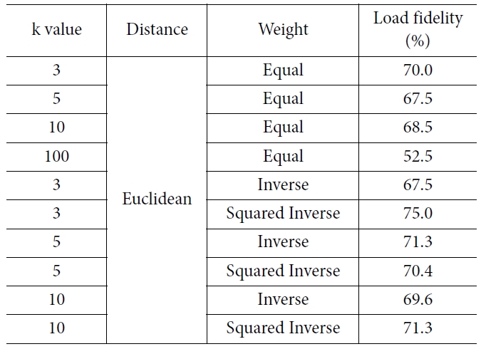 가중치가 squared inversed 일 때 가장 높은 하중 충실도가 도출되었다. 가중치가 Equal이고 k 값이 커질수록 하중 충실도가 낮아지는