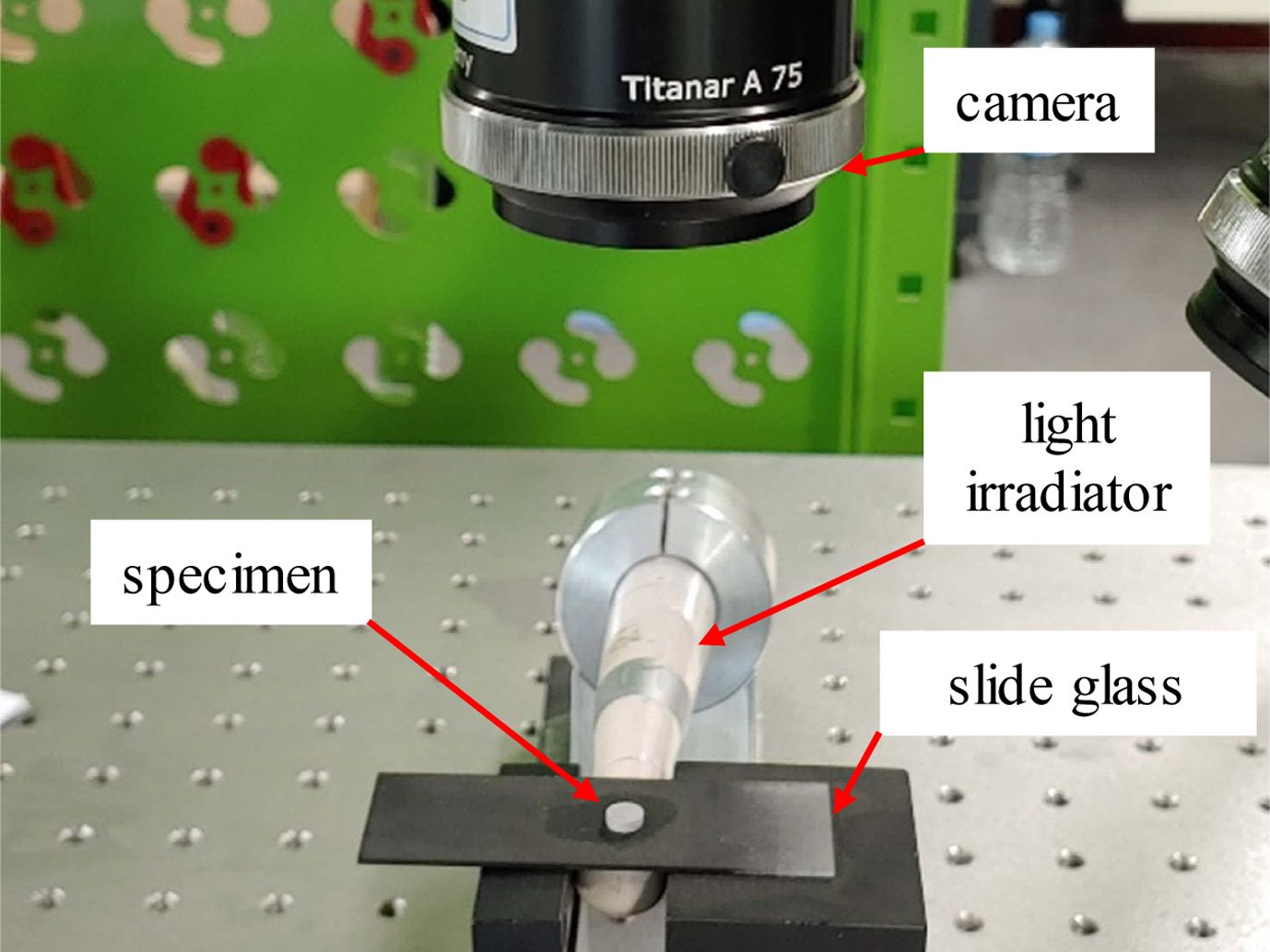 Fig. 2와 같이 실험 장치를 구성하였으며 광조사는 시편표면으로부터 2 mm 위치에서 광원의 세기를 1000 W로 광조사시간은