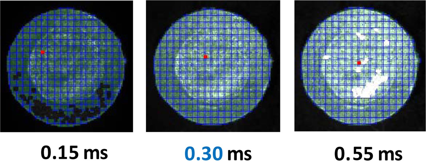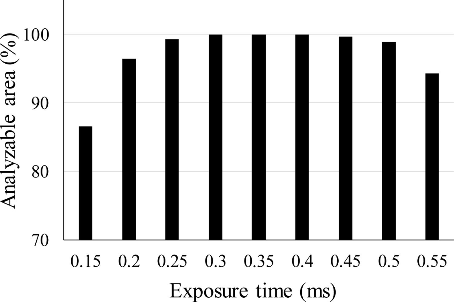 Fig. 3은 노출시간에 따른 DIC해석 가능한 영역을 나타낸 사진이다. 노출시간이 0.15 ms 부터 0.55 ms 까지 0.05