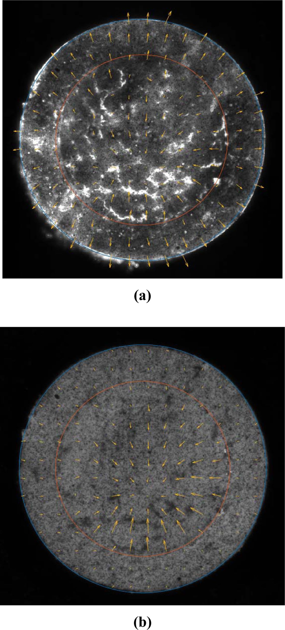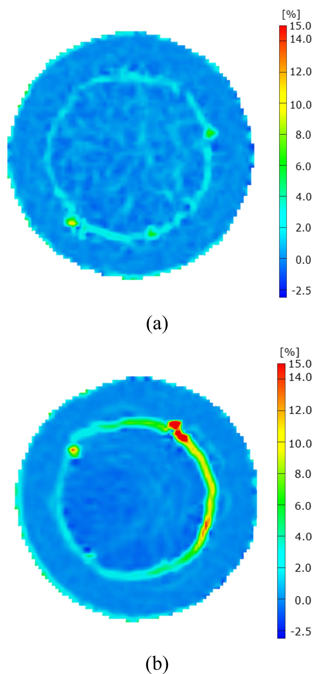 Fig. 6 Displacement distributions of a composite resin-filled ring specimen for P90 measured by DIC (a) just before the end of light irradiation and (b) at a cured state for 10 minutes |