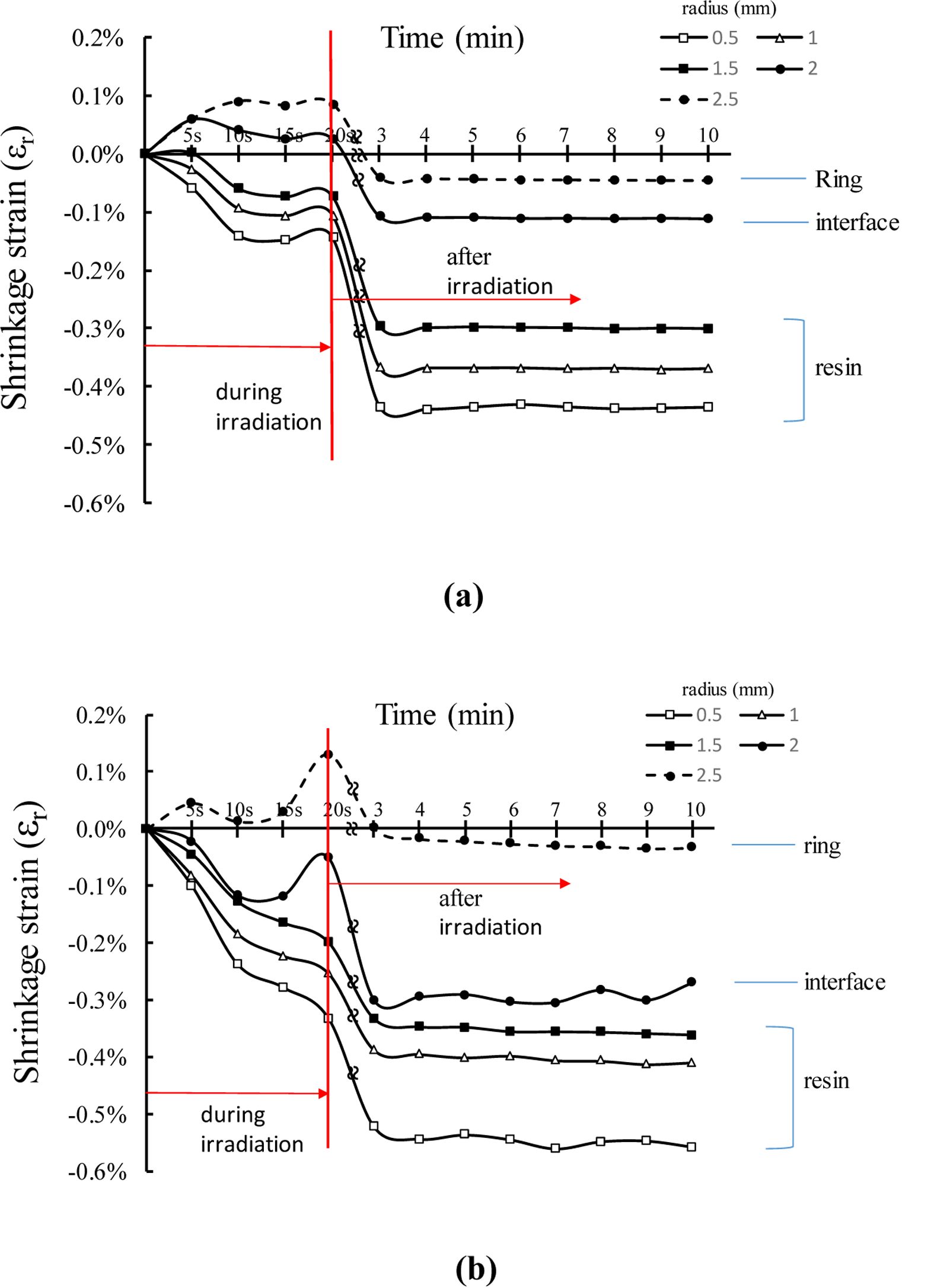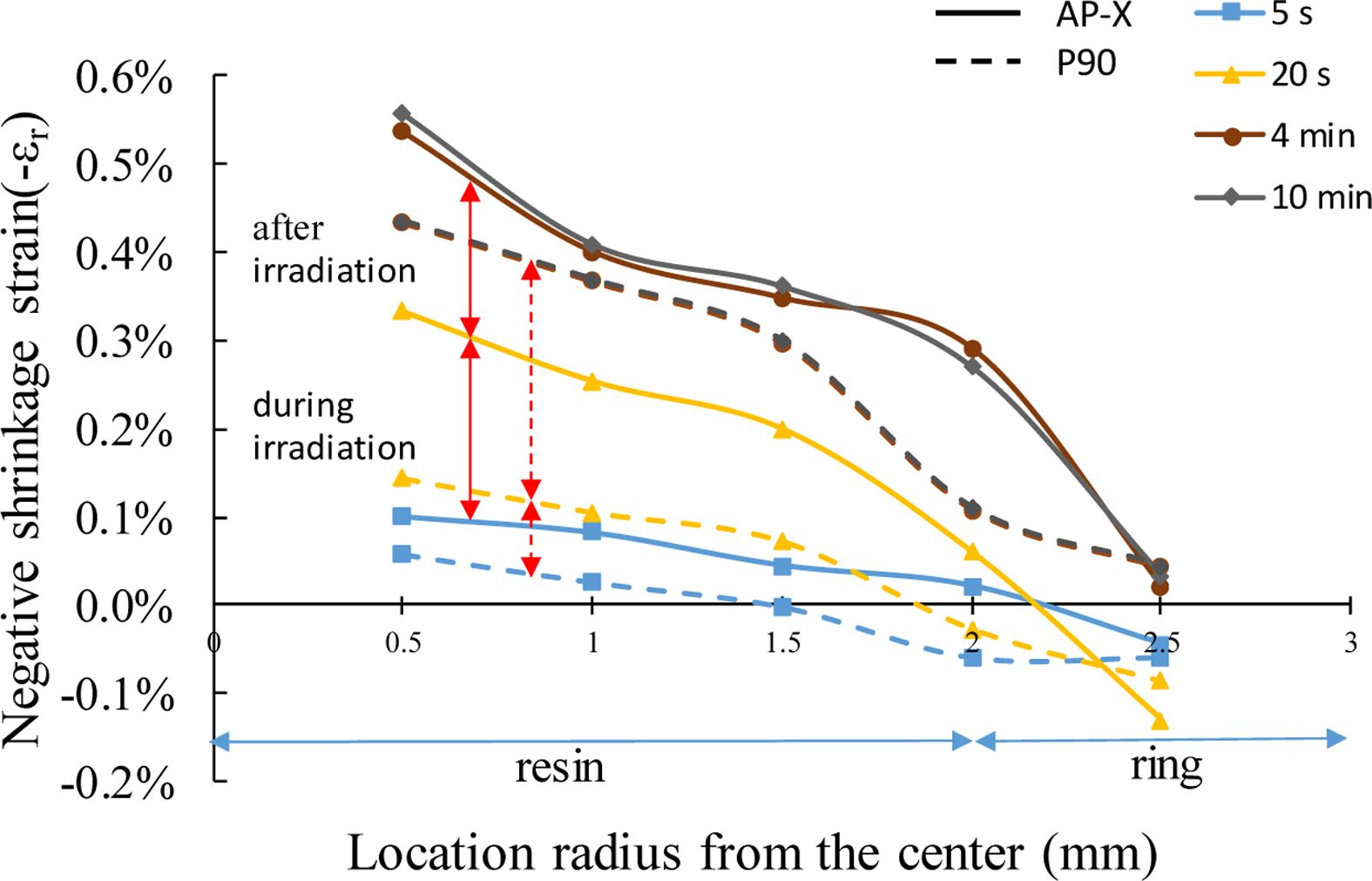 거리가 멀어질수록 반경방향 평균수축률은 감소하였으며, 광조사동안에 발생한 반경방향 평균수축률은 경화시험종료(10 min) 후 발생한 반경방향 평균수축률 값을 기준으로 P90은 33%, AP-X는 57% 수준이었다. P90과 AP-X가 광조사 중의 수축거동이 크게 달랐음을 확인하였다. 레진/링의 계면부에 가까운 레진에서는 광조사 후에 인장변형률이 급격히