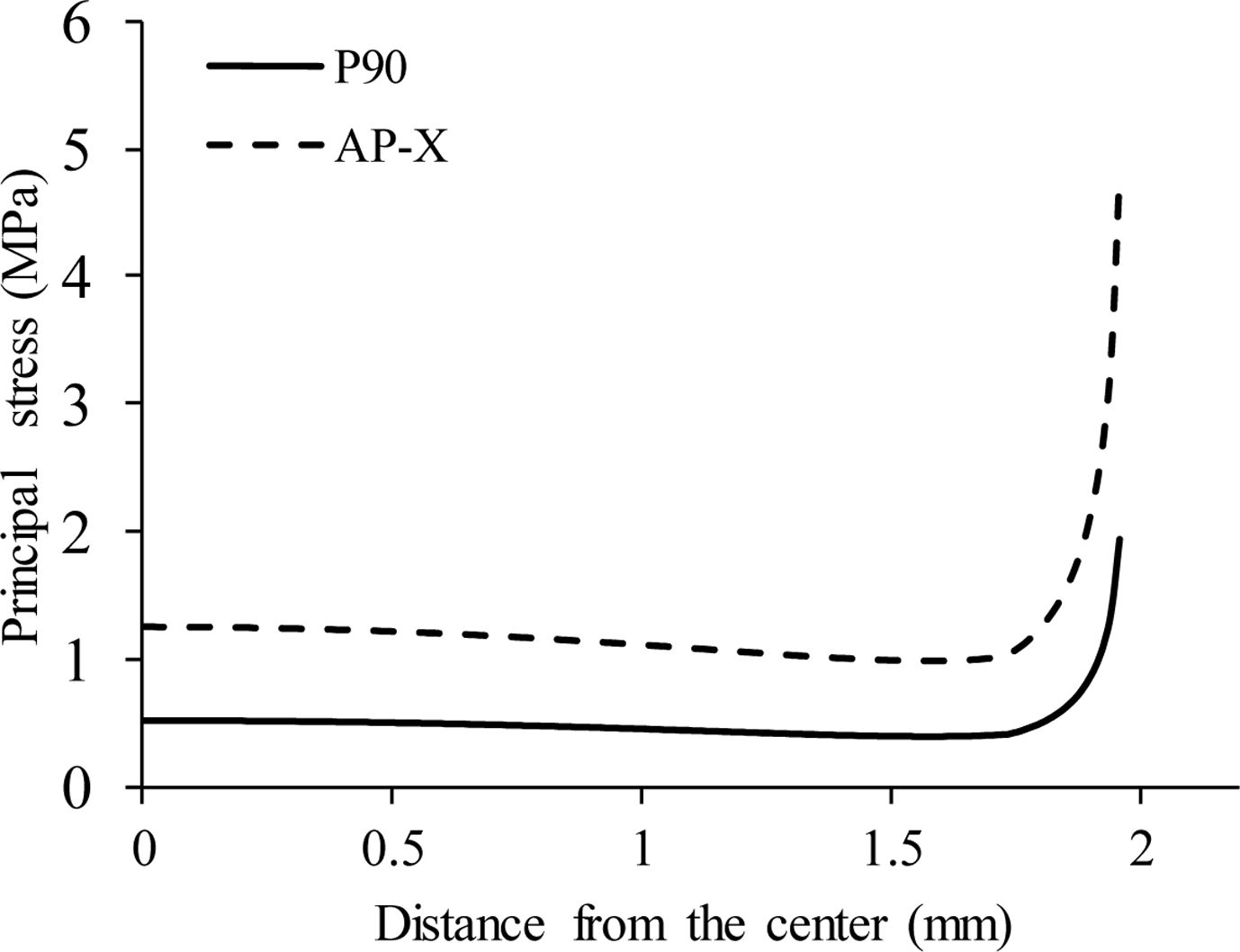 종료시(10 min) 반경방향 평균수축률은 AP-X는 r이 0.5~1.0 mm 구간을 따라 수축률이 가장 컸으나 P90은 r이 1.5~2.0