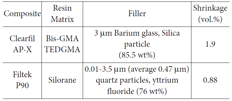 본 연구에서는 수축률이 크게 다른 Filtek P90 (3M ESPE, USA)과 AP-X (Kuraray, Japan)를 선택하여