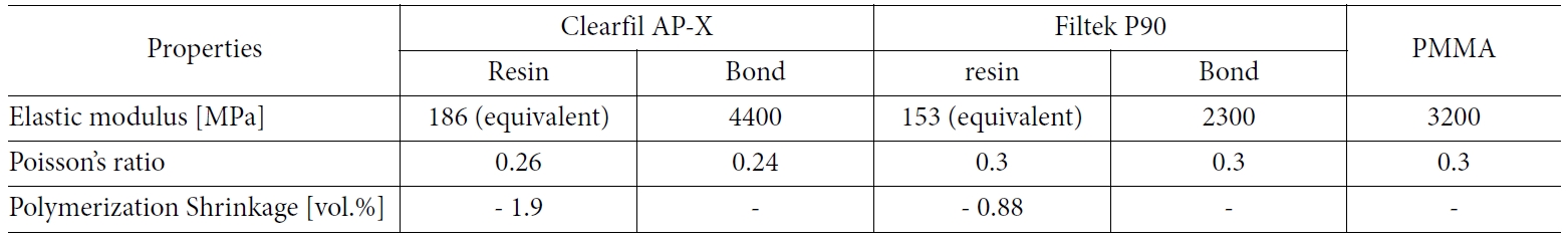 Table 2 Material properties of dental composite resins and PMMA for finite element calculation |