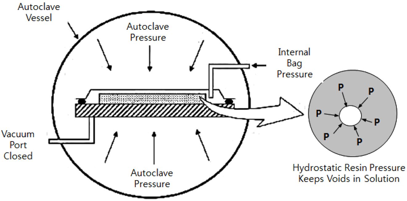 Fig. 2에 모사된 바와 같이 외부 가압 방법은 오토클레이브 성형법의 경우 수지 내에 존재하는 기포들의 자체 공기 압력을 능가하는