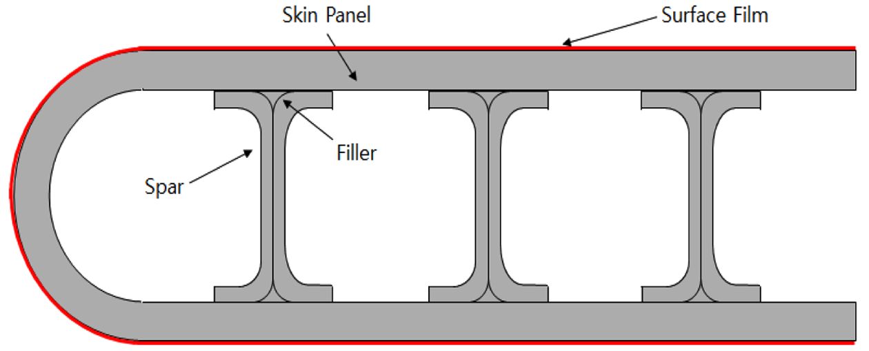 2개의 “C” 형 부분품으로 적층한 뒤 충진재(Filler)를 추가/조립하여 제작하고 스킨은 별도의 몰드 위에서
