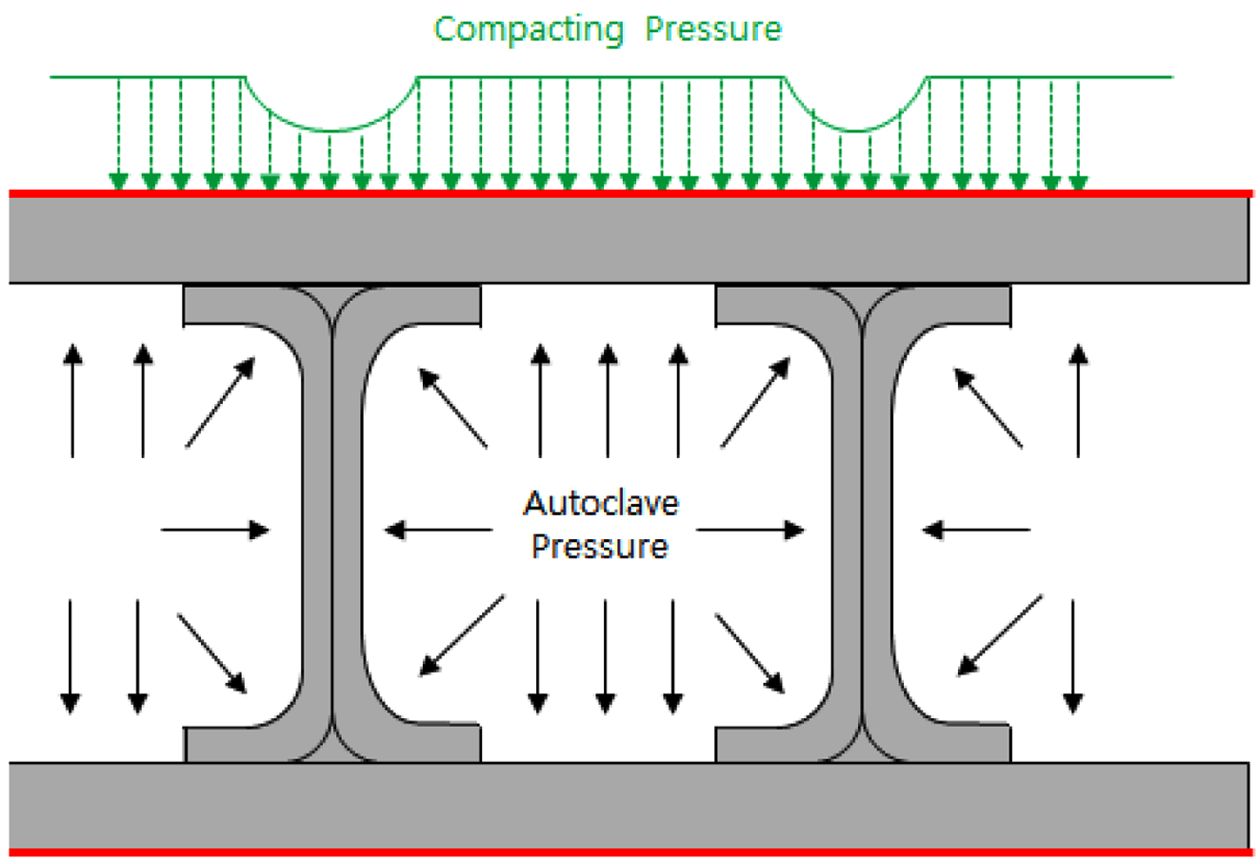 중간에 위치한 스파 구조물의 영향으로 내부로부터 가해지는 오토클레이브 압력이 스킨을 통해서 상하형 몰드로 전달되는 과정에서 스킨에 가해지는 압밀압력의
