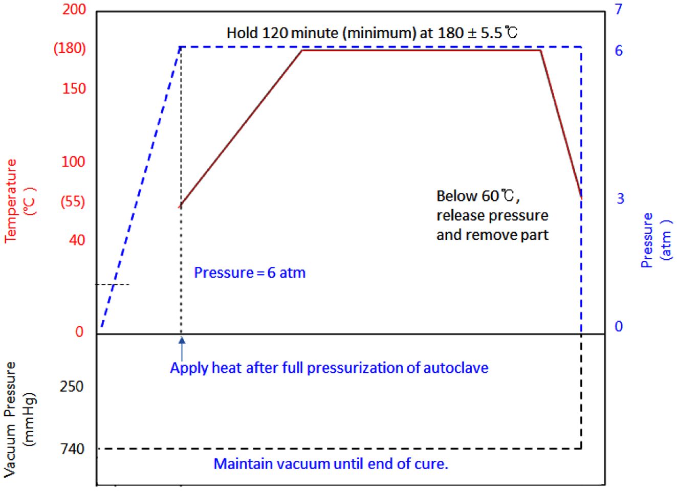 아래 Fig. 8과 같은 오토클레이브 경화사이클을 적용하였는데, 전체경화사이클