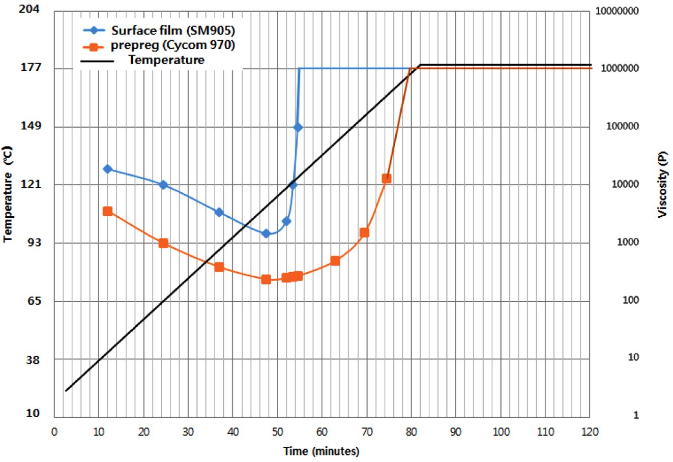 Fig. 9 Viscosity profile for both carbon fiber prepreg (Cycom 970) and surface film (SM905) |