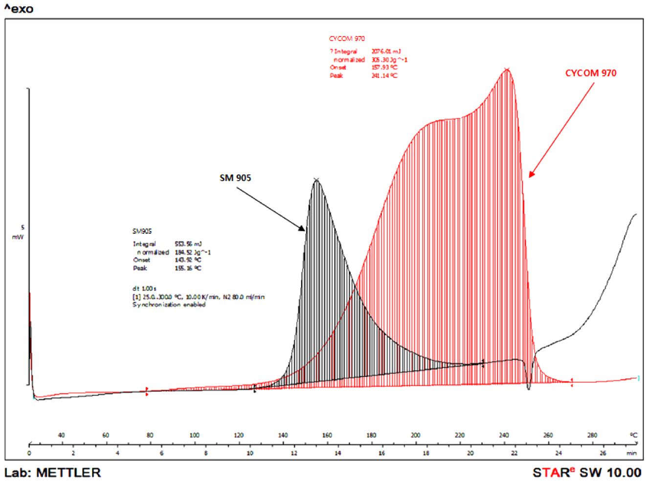 Fig. 10 DSC data for both carbon fiber prepreg (Cycom 970) and surface film (SM905) |